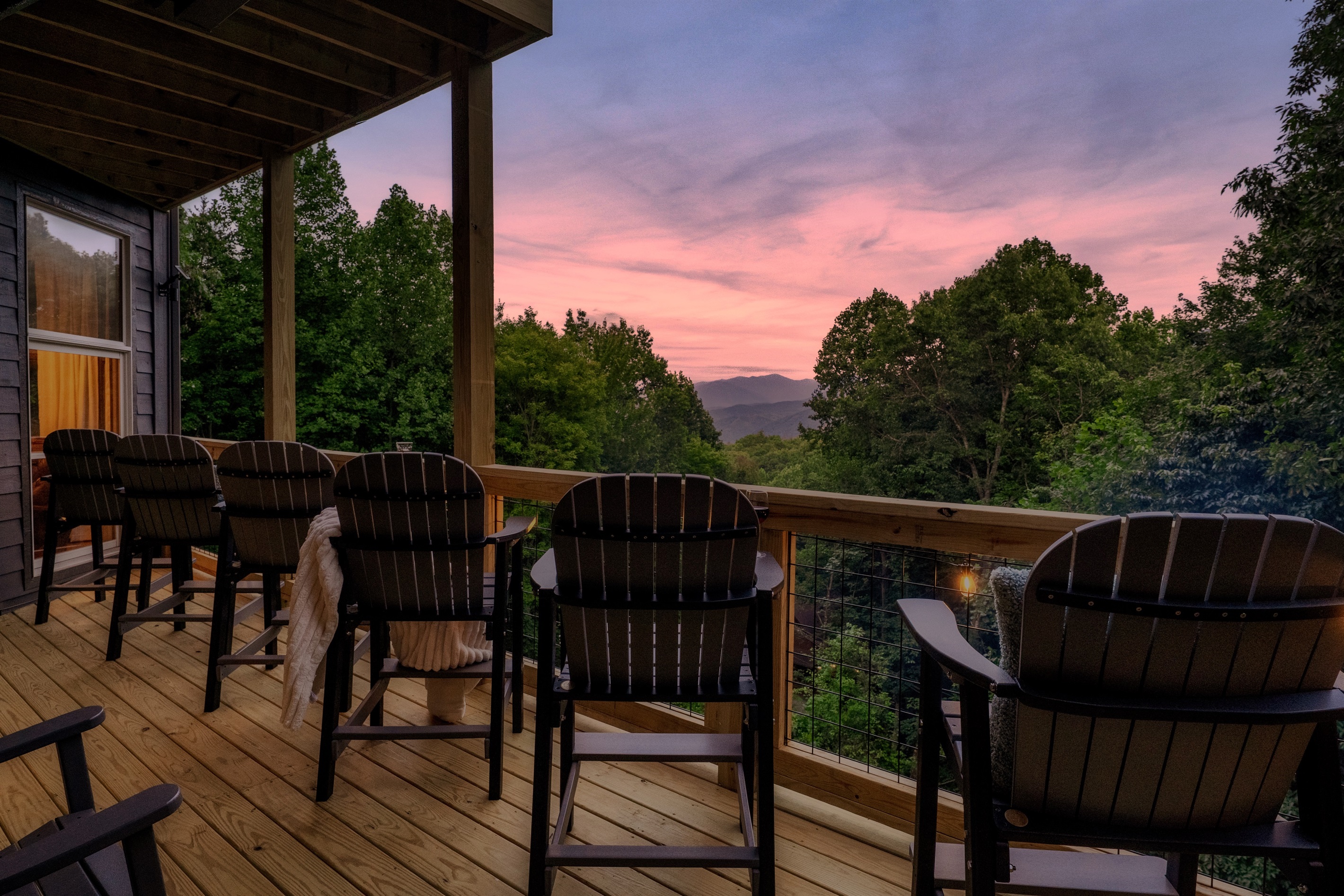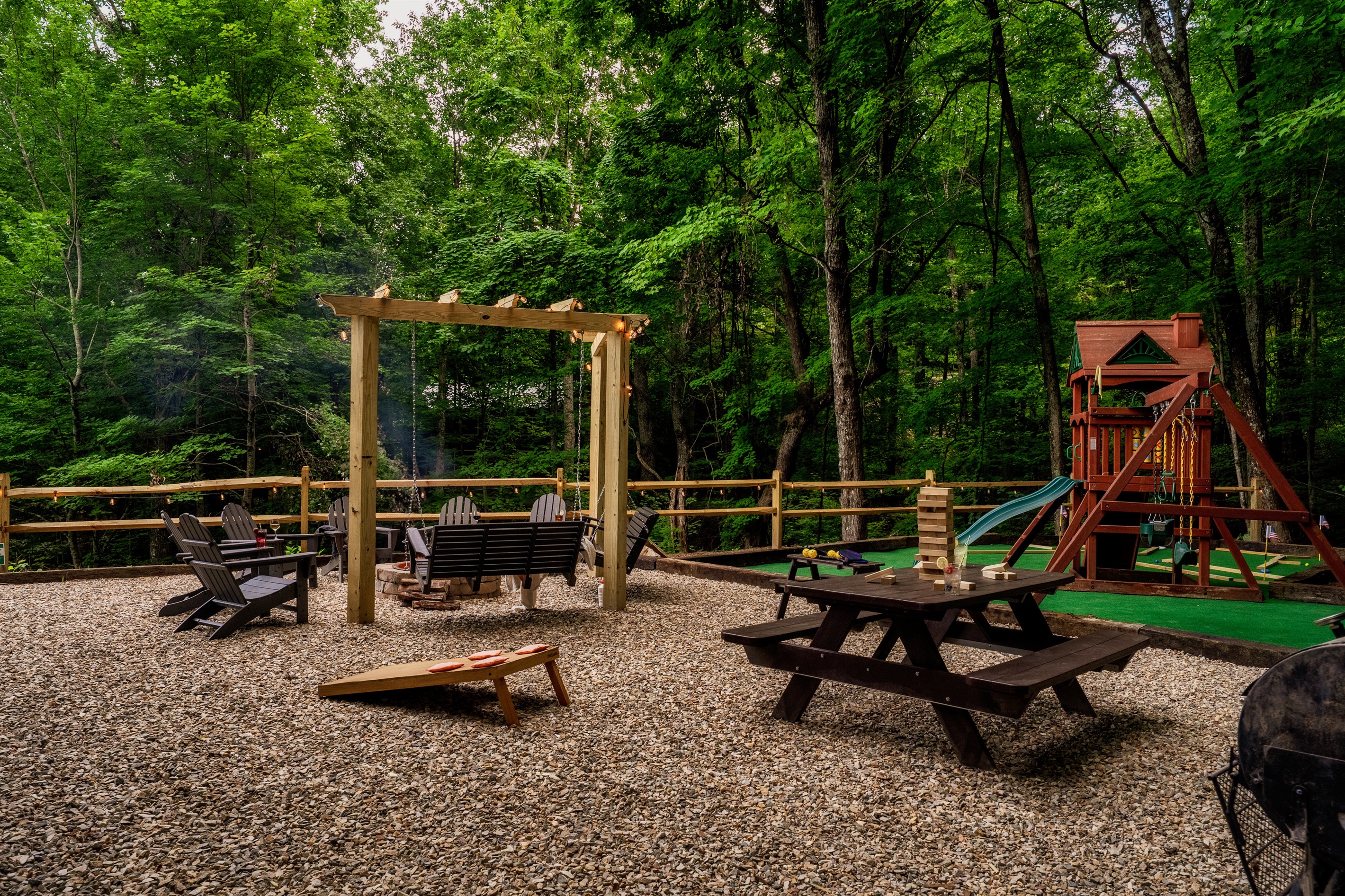 Build a fire in the outdoor fire pit, roast marshmallows, and take in the mountain views while relaxing on the swings. Prepare a great meal on the charcoal grill while the kids play on the playset or play mini golf. Then, sit quietly on the lower deck in the comfy oversized egg chairs to watch the ever changing mountain scenery as the sun sets. Charcoal and firewood is not provided.